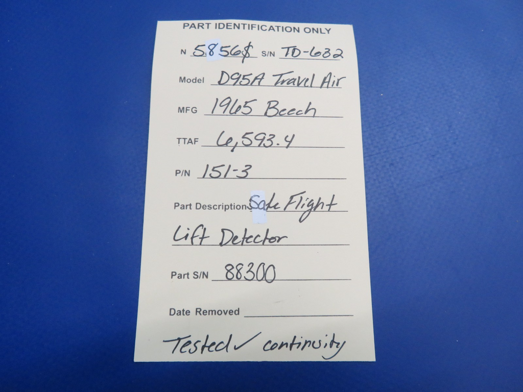 Safe Flight Lift Detector. P/N 151-3. S/N 88300. This item was recently tested for continuity and found to be in working condition. Removed in good condition from a parted out 1965 Beech D95A Travel Air N5856S, S/N TD-632 TTAF 6,593.4. Guaranteed to pass inspection or your money back.