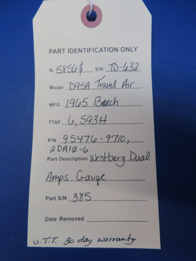 Beech D95A Travel Air Westberg Dual Amps Gauge. P/N 95476-9710, 2DA10-6. S/N 385. We are unable to test this unit, however, we are selling this unit a 30 day warranty. Removed in good condition from a parted out 1965 Beech D95A Travel Air N5856S, S/N TD-632 TTAF 6,593.4. Guaranteed to pass inspection or your money back.