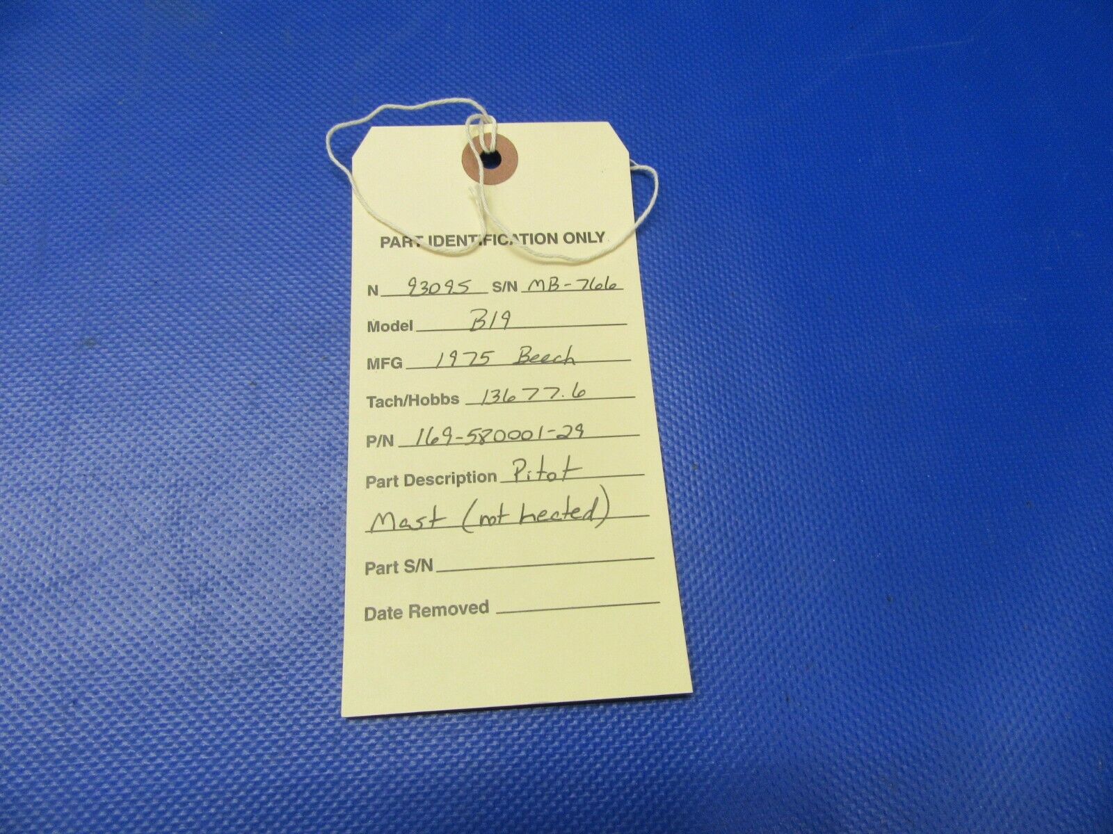 Beech B19 Sport Pitot Mast. P/N 169-58001-29. This is for an unheated Pitot. Removed in good condition from a parted out 1975 Beech B19 Sport N9309S, S/N MB-766. Aircraft TT 13,677.6. Guaranteed to pass inspection or your money back.