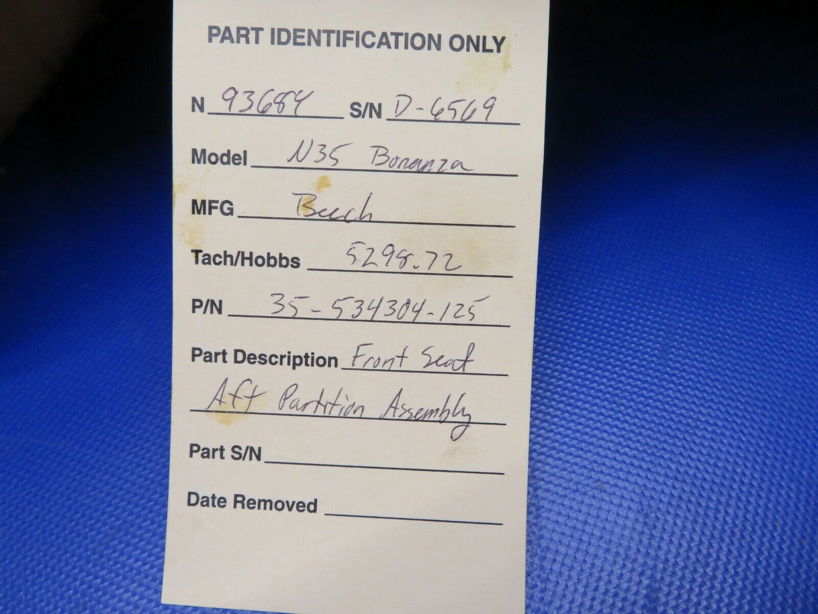 Beech N35 Bonanza Front Seat AFT Partition Assembly. P/N 35-534304-125. Removed in good condition from a parted out 1961 Beech N35 Bonanza, N9368Y, S/N D-6569. TTAF 5298.72. Guaranteed to pass inspection or your money back.