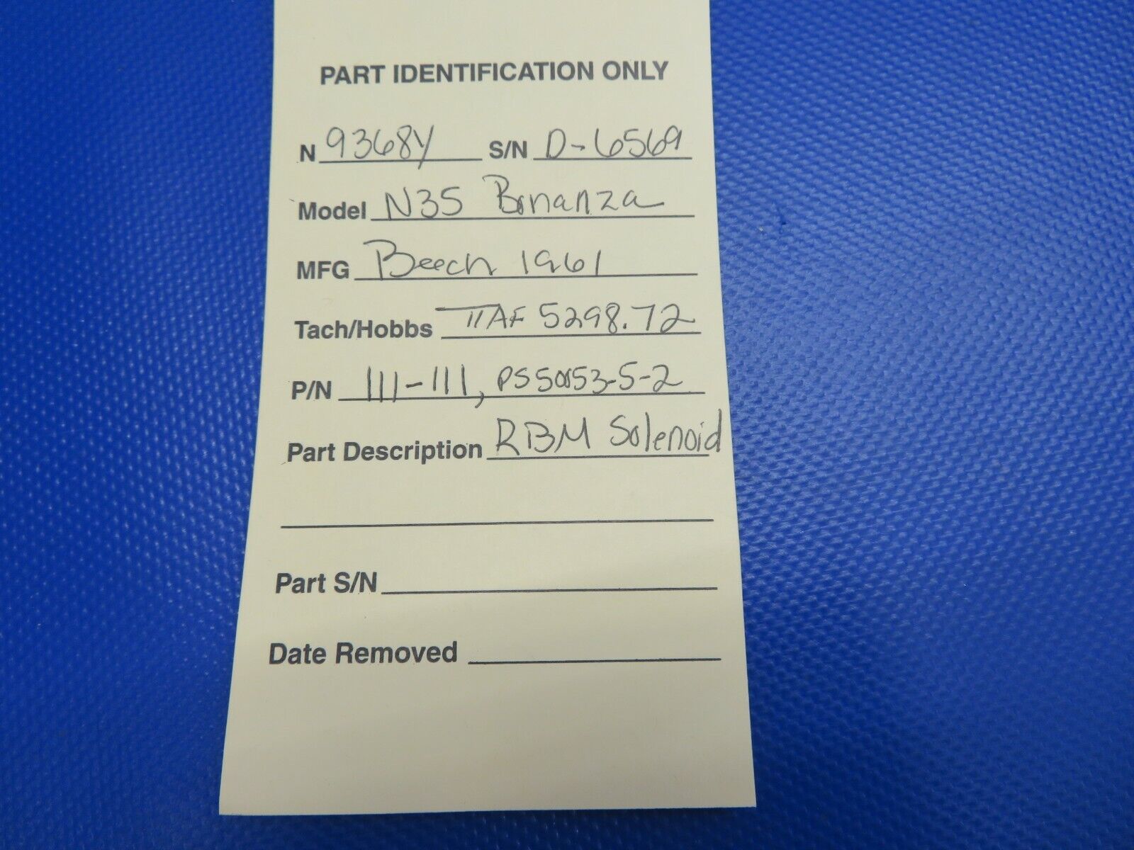Beech N35 Bonanza RBM Solenoid. P/N 111-111, PS50053-5-2. Removed in working condition from a parted out 1961 Beech N35 Bonanza, N9368Y, S/N D-6569. TTAF 5298.72. Guaranteed to pass inspection or your money back.