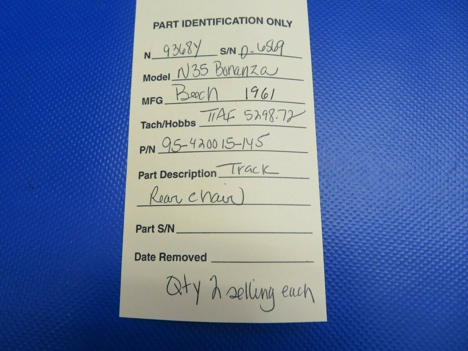 Beech N35 Bonanza Track Rear Chair. P/N 95-420015-145. Removed in good condition from a parted out 1961 Beech N35 Bonanza, N9368Y, S/N D-6569. TTAF 5298.72. Guaranteed to pass inspection or your money back.