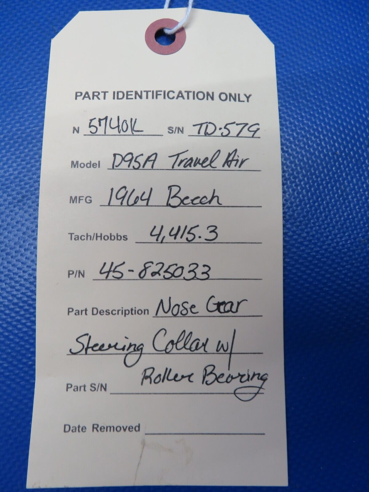 Beech D95A Travel Air Nose Gear Steering Collar with Roller Bearing. P/N 45-825033. Removed in good condition from a parted out 1964 Beech D95A Travel Air N5740K, S/N TD-579. TTAF 4,415.3. Guaranteed to pass inspection or your money back.