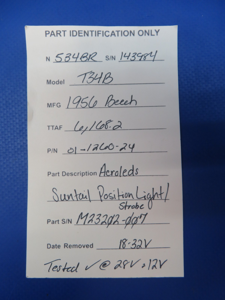 Beech T-34 / T-34B Aeroleds Suntail Tail Position Light / Strobe. 18-32 Volts. White LED Strobe Lights. P/N 01-1260-24. S/N M23202-007. This item was recently tested at 28 and 12v and found to be in working condition. Removed in good condition from a parted out 1956 Beech T-34B Mentor N534BR, S/N 143984. TTAF 6,168.2. Military Model D-45, S/N BG-291. Guaranteed to pass inspection or your money back.