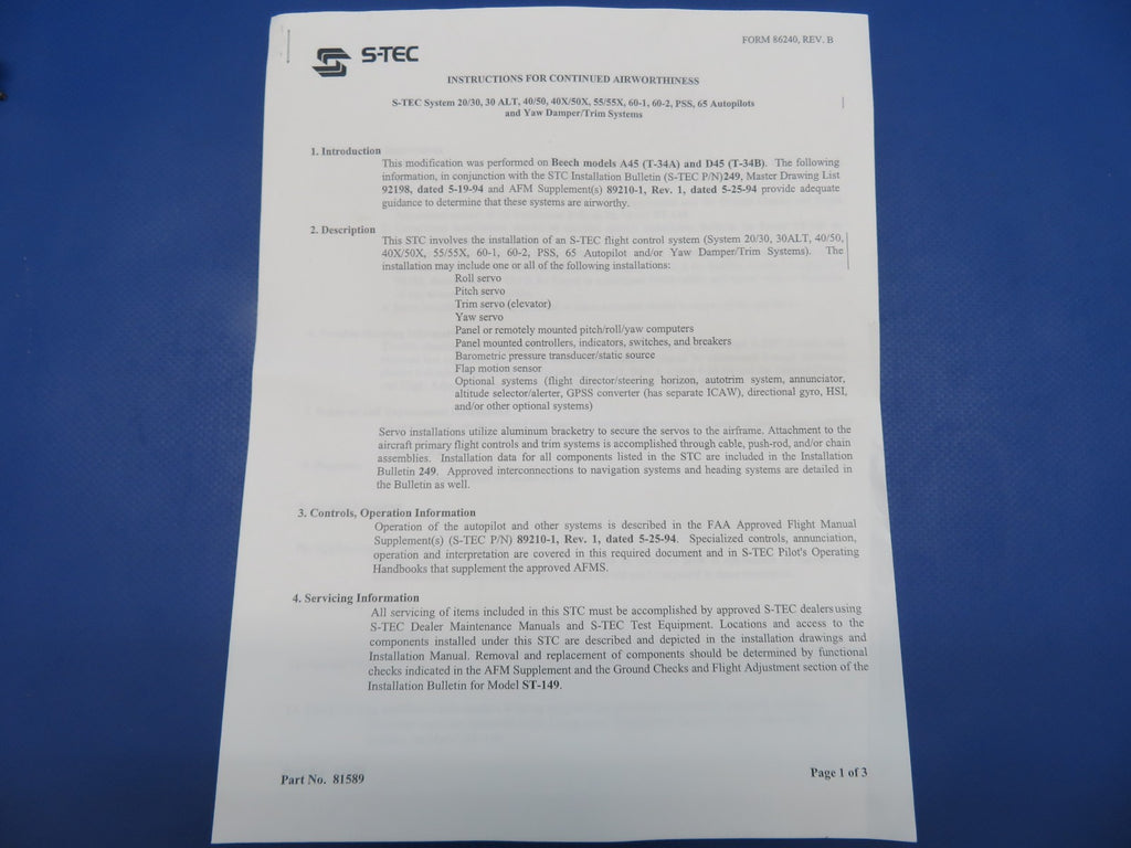 S-Tec Roll Servo with Connector and Brackets. P/N 0106-R1. S/N 1047SA. Includes a copy of STC SA09339AC-D. We are unable to test this unit, however, we are selling this unit with a 30 day warranty. Removed in good condition from a parted out 1956 Beech T-34B Mentor N534BR, S/N 143984. TTAF 6,168.2. Military Model D-45, S/N BG-291. Guaranteed to pass inspection or your money back.