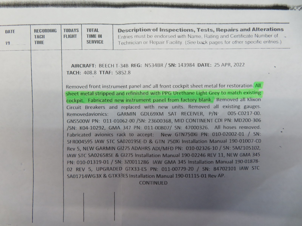 This panel held a GDU460 Display. Removed in good condition from a parted out 1956 Beech T-34B Mentor N534BR, S/N 143984. TTAF 6,168.2. Military Model D-45, S/N BG-291. Guaranteed to pass inspection or your money back.