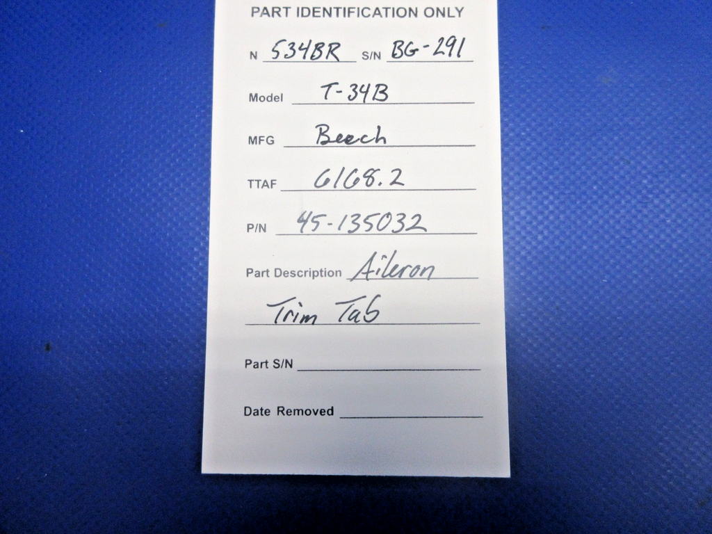 Beech T-34 / T-34B Aileron Trim Tab. P/N 45-135032. Removed in good condition from a parted out 1956 Beech T-34B Mentor N534BR, S/N 143984. TTAF 6,168.2. Military Model D-45, S/N BG-291. Guaranteed to pass inspection or your money back.