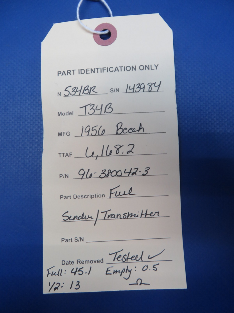 Beech T-34 / T-34B Fuel Sender / Transmitter. P/N 96-380042-3. This item was recently tested and found to be in working condition. Removed in good condition from a parted out 1956 Beech T-34B Mentor N534BR, S/N 143984. TTAF 6,168.2. Military Model D-45, S/N BG-291. Guaranteed to pass inspection or your money back.