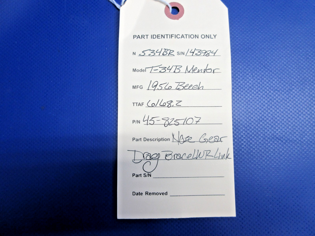 Beech T-34 / T-34B Nose Gear Drag Brace Lower Link. P/N 45-825107. Removed in good condition from a parted out 1956 Beech T-34B Mentor N534BR, S/N 143984. TTAF 6,168.2. Military Model D-45, S/N BG-291. Guaranteed to pass inspection or your money back.