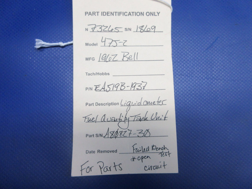Bell 47J-2 Liquidometer Fuel Quantity Tank Unit. P/N EA159B-1937. S/N A80827-30. FOR PARTS. Failed Bench Open test circuit. Removed from a parted out N73265, S/N 1869.