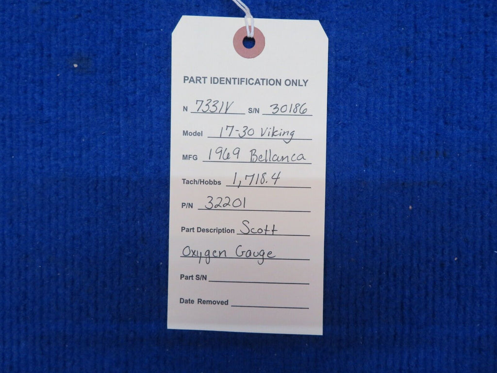 Bellanca 17-30 Viking Scott Oxygen Gauge. P/N 32201. Removed in good condition from a parted out 1969 Bellanca 17-30 Viking N7331V, S/N 30186. TTAF 1,718.4. Guaranteed to pass inspection or your money back.