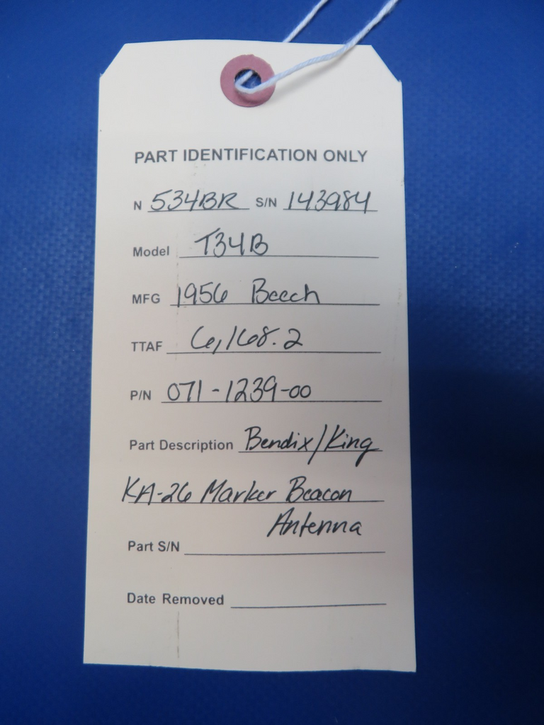 Beech T-34 / T-34B Bendix / King KA-26 Marker Beacon Antenna. P/N 071-1239-00. Removed in good condition from a parted out 1956 Beech T-34B Mentor N534BR, S/N 143984. TTAF 6,168.2. Military Model D-45, S/N BG-291. Guaranteed to pass inspection or your money back.