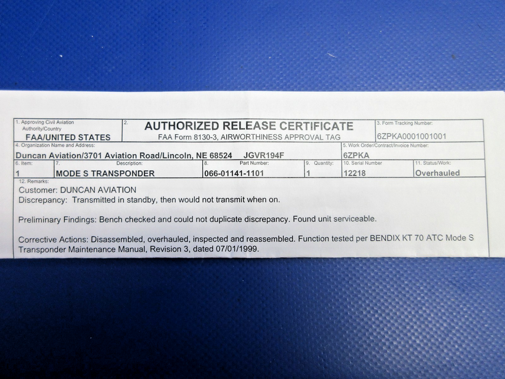 Bendix/King KT70 Mode S ATC Transponder W/8130 P/N 066-01141-1101 (1025-2035)