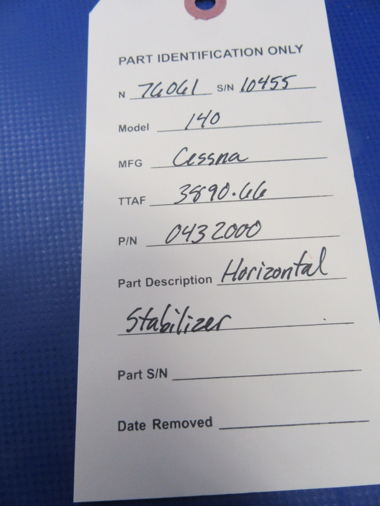 Cessna 120 / 140 Horizontal Stabilizer P/N 0432000. Numerous very minor dings in the leading edge (FOD), a few other minor dings elsewhere. Removed from parted-out 1946 Cessna 140 N76061, S/N 10455. Aircraft TT 3890.66. Guaranteed to pass inspection or your money back.