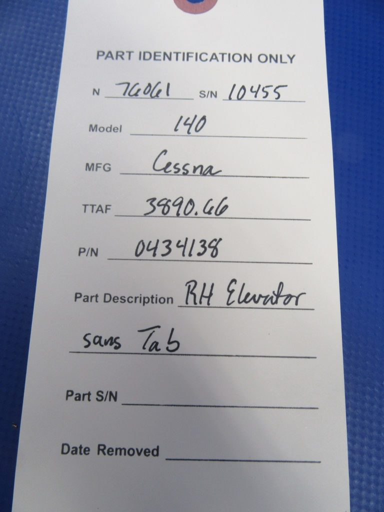 Cessna 120 / 140 RH Elevator without tab P/N 0434138. Overall good condition, no hail noted, minor dings. Removed from parted-out 1946 Cessna 140 N76061, S/N 10455. Aircraft TT 3890.66. Guaranteed to pass inspection or your money back.