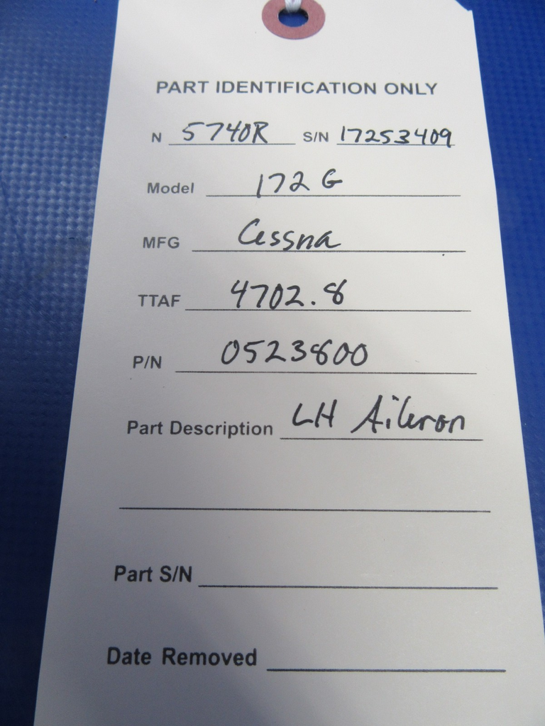 Cessna 140A / 150 / 152 / 170 / 172 / 175 LH Aileron P/N 0523800. Moderate hail and other dings, see photos. Removed from parted-out 1966 Cessna 172G N5740R, S/N 17253409. Aircraft TT 4702.8. Guaranteed to pass inspection or your money back.