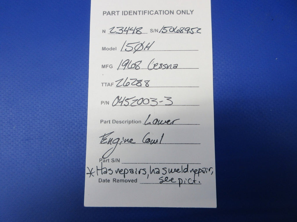 Cessna 150 / 150H Lower Engine Cowl. P/N 0452003-3. Has repairs and weld repairs, see pictures. Removed in good condition from a parted out 1968 Cessna 150H N23448, S/N 15068952. TTAF 4292.74. Guaranteed to pass inspection or your money back.