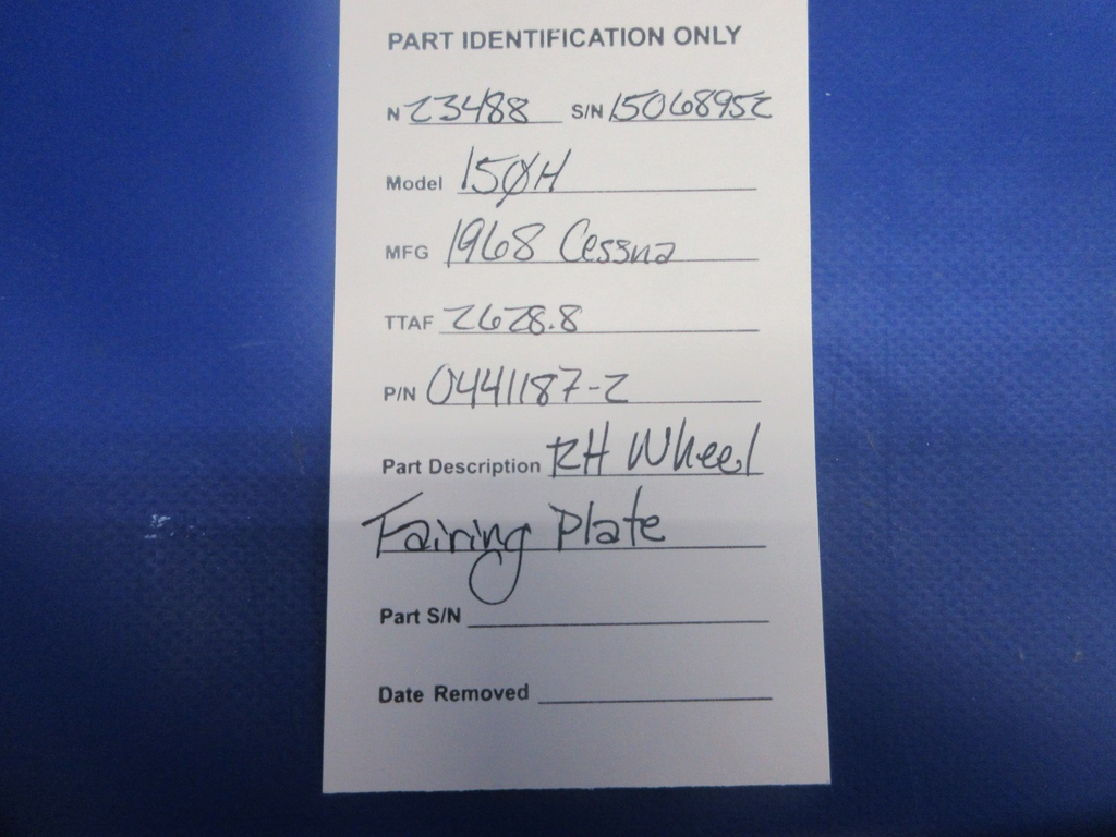 Cessna 150 / 150H Right Hand Wheel Fairing Plate. P/N 0441187-2. Removed in good condition from a parted out 1968 Cessna 150H N23448, S/N 15068952. TTAF 4,292.74. Guaranteed to pass inspection or your money back.