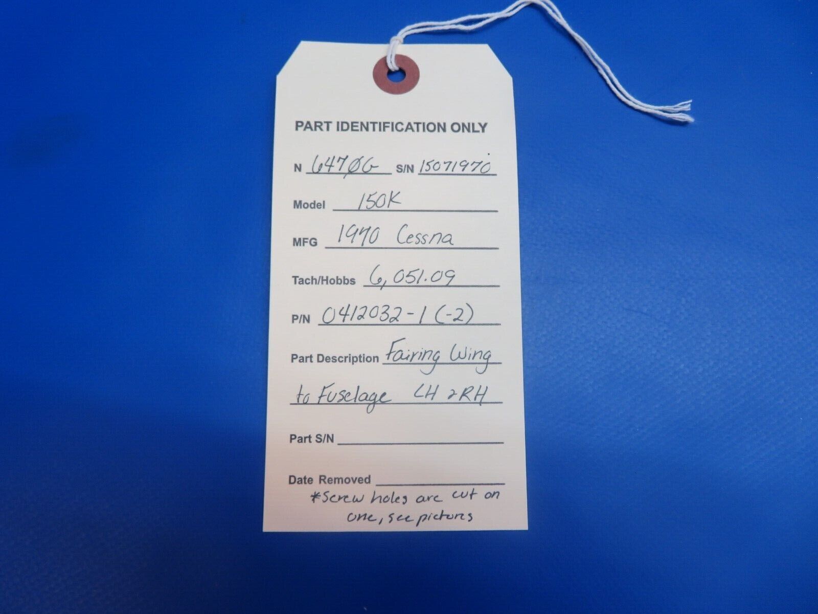 Cessna 150 / 150K Fairing Wing to Fuselage Left Hand & Right Hand. P/N 0412032-1, 0412032-1-2. Screw holes are cut on one, see pictures. Removed in good condition from a parted out 1970 Cessna 150K N6470G, S/N 15071970. TTAF 6,051.09. Guaranteed to pass inspection or your money back.