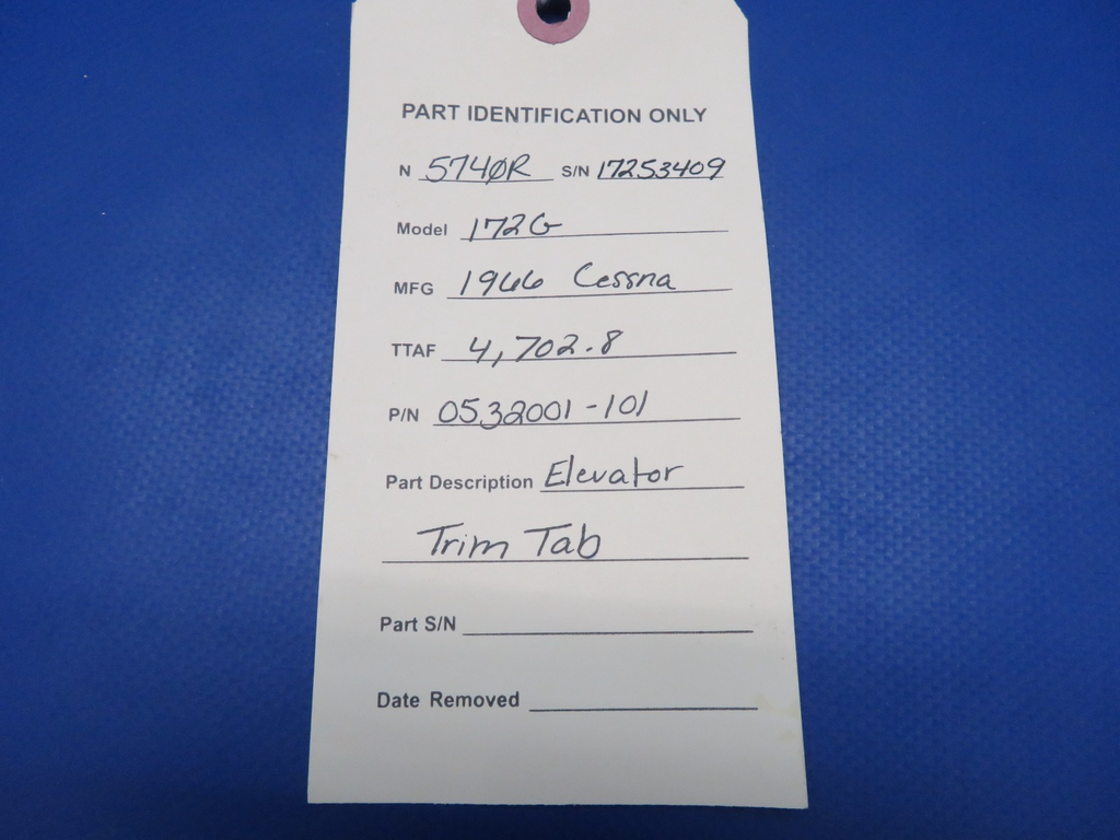 Cessna 172 / 172G Elevator Trim Tab. P/N 0532001-101. There is a chip on one of the ribs, see picture. Removed in good condition from a 1966 Cessna 172G N5740R, S/N 17253409. TTAF 4,702.8. Guaranteed to pass inspection or your money back.