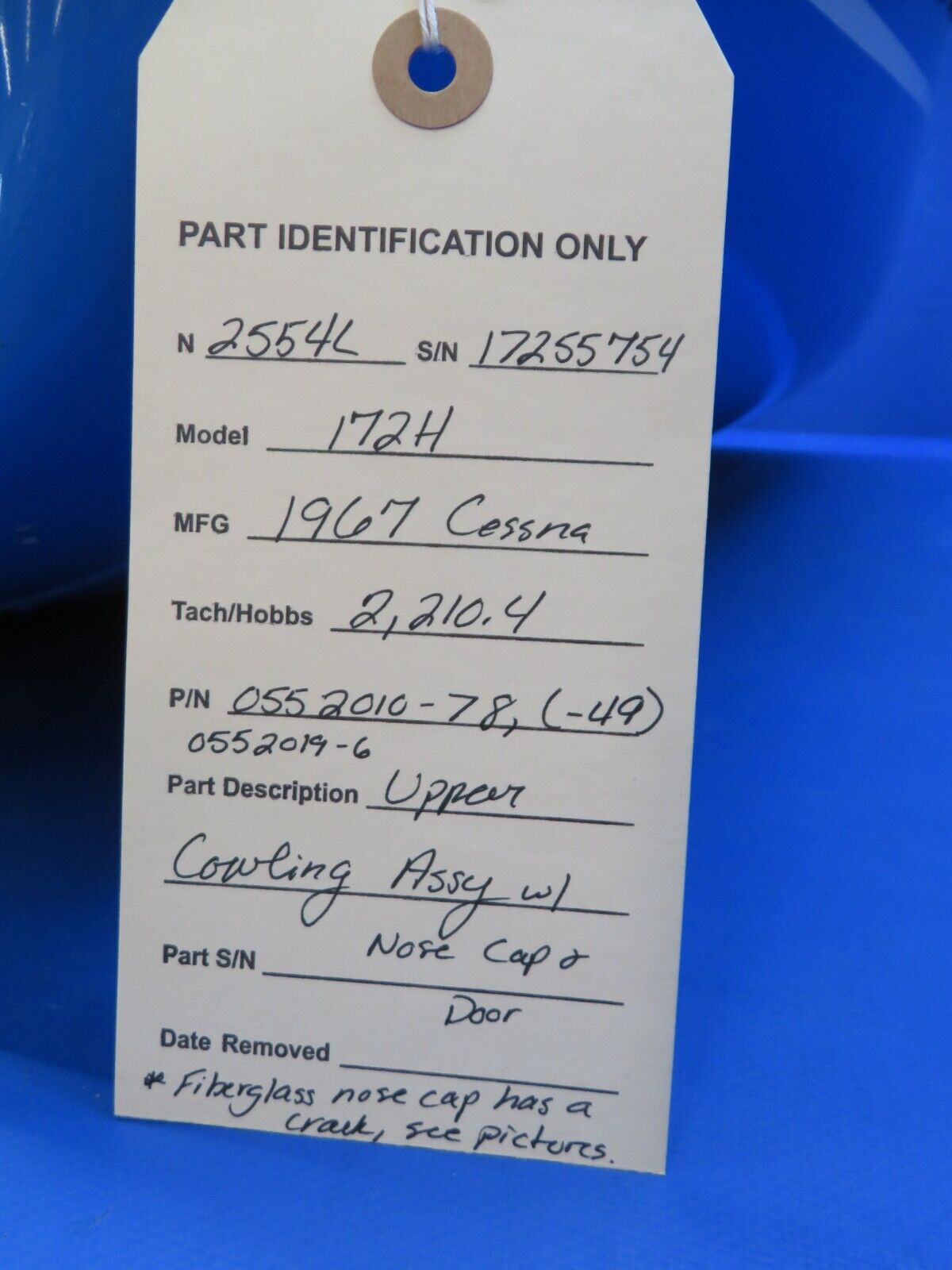Cessna 172 / 172H Upper Cowling Assembly w/ Nose Cap & Door. Fiberglass. PN 0552010-78, 0552010-49, 0552019-6. Nose cap has a crack, see photos. Removed in good condition from a parted out 1967 Cessna 172H N2554L, S/N 17255754. TTAF 2,210.4. Guaranteed to pass inspection or your money back.