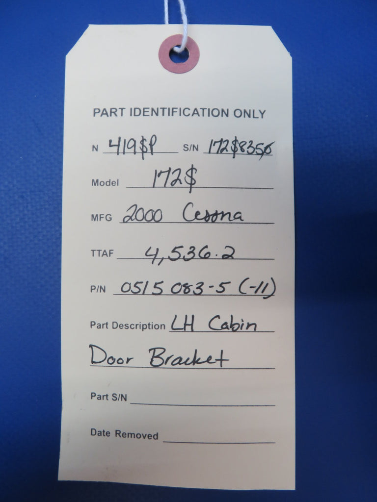 Cessna 172 / 172S Left Hand Cabin Door Bracket. P/N 0515083-5, 0515083-11. Removed in good condition from a parted out 2000 Cessna 172 / 172S N419SP, S/N 172S8350. TTAF 4536.2. Guaranteed to pass inspection or your money back.