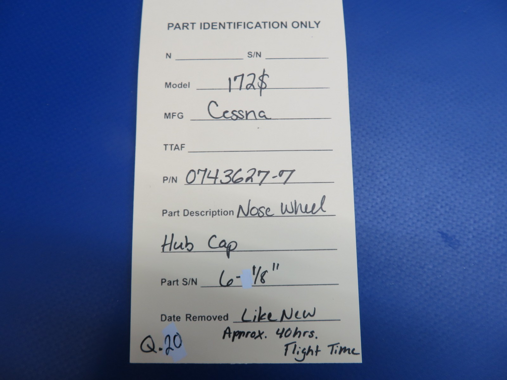 Cessna 172 / 172S Nose Wheel Hub Cap. P/N 0743627-7. Diameter 6-1/8". Like New / Low Time. Approximately 40 hours or less flight time. Due to multiple quantities buyer may not receive exact item pictured. Guaranteed to pass inspection or your money back.