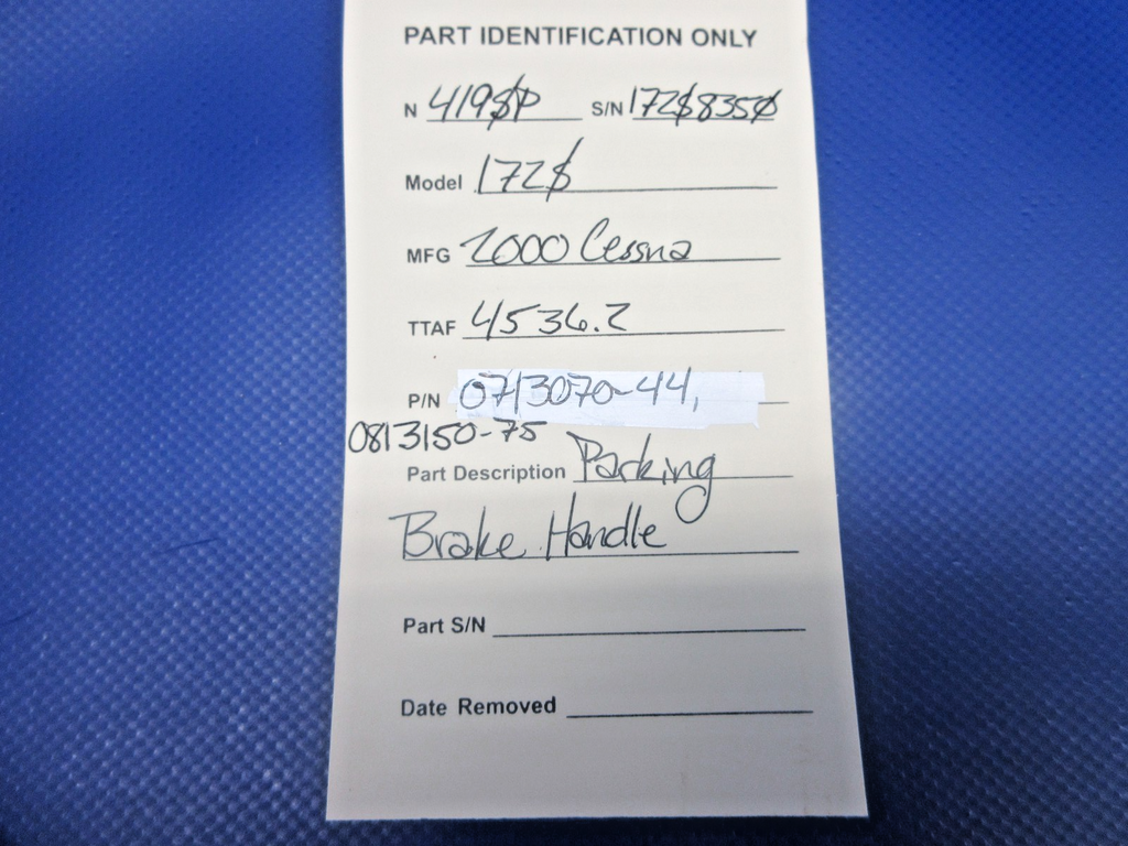 Cessna 172 / 172S Parking Brake Handle. P/N 0713070-44, 0813150-75. Removed in good condition from a parted out 2000 Cessna 172S N419SP, S/N 172S8350. TTAF 4,536.2. Guaranteed to pass inspection or your money back.
