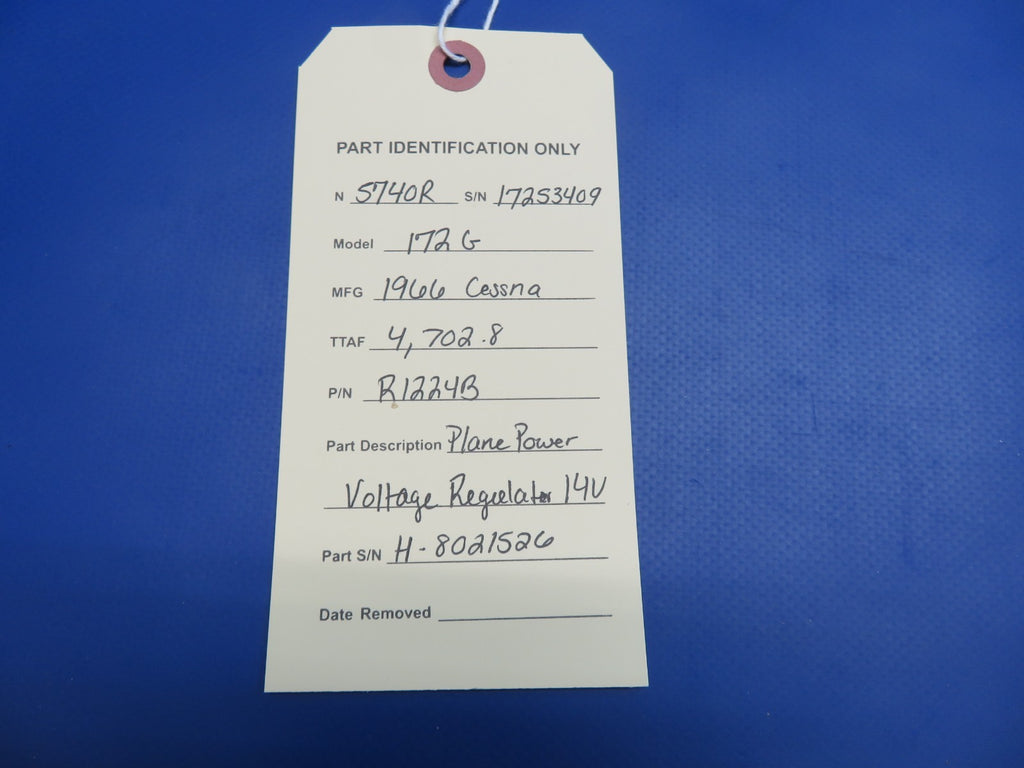 Cessna 172 / 172G Plane Power Voltage Regulator. 14 Volts. P/N R1224B. S/N H-8021526. Removed in good condition from a parted out 1966 Cessna 172G N5740R, S/N 17253409. TTAF 4,702.8. Guaranteed to pass inspection or your money back.