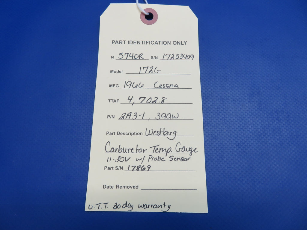 Cessna 172 / 172G Westberg / Westach Carburetor Temperature Gauge with Probe Sensor. 11-30 Volts. P/N 2A3-1. S/N 17869. Probe P/N 399W. S/N 3274. We are unable to test this unit, however, we are selling this unit with a 30 day warranty. Removed in good condition from a 1966 Cessna 172G N5740R, S/N 17253409. TTAF 4,702.8. Guaranteed to pass inspection or your money back.