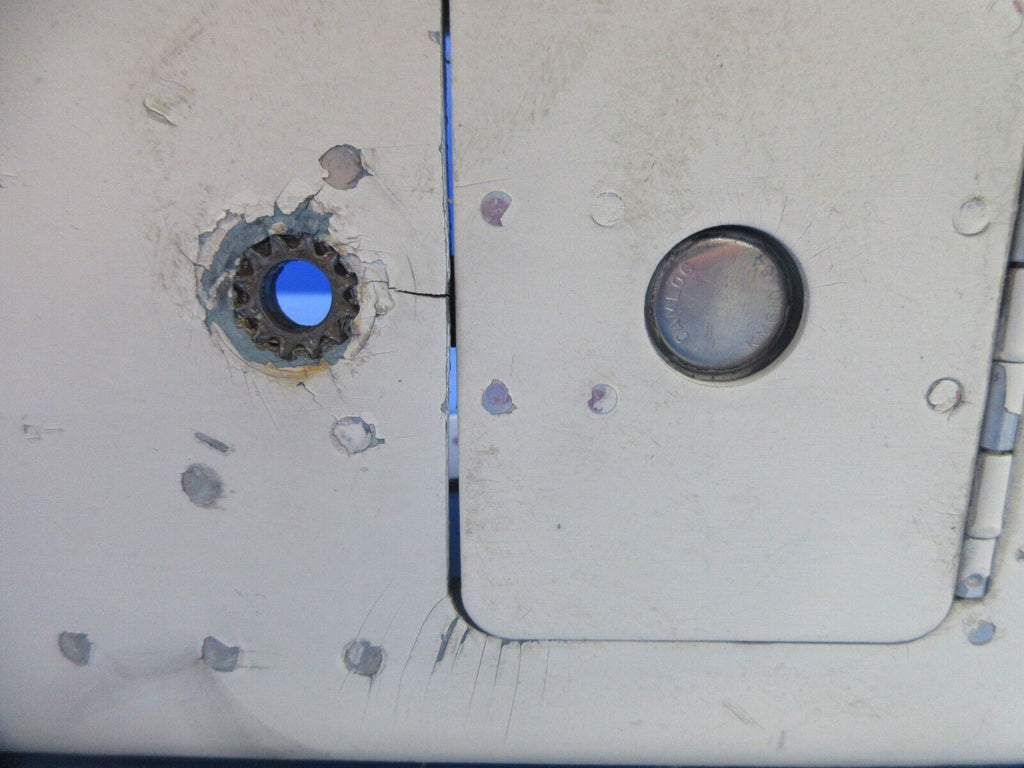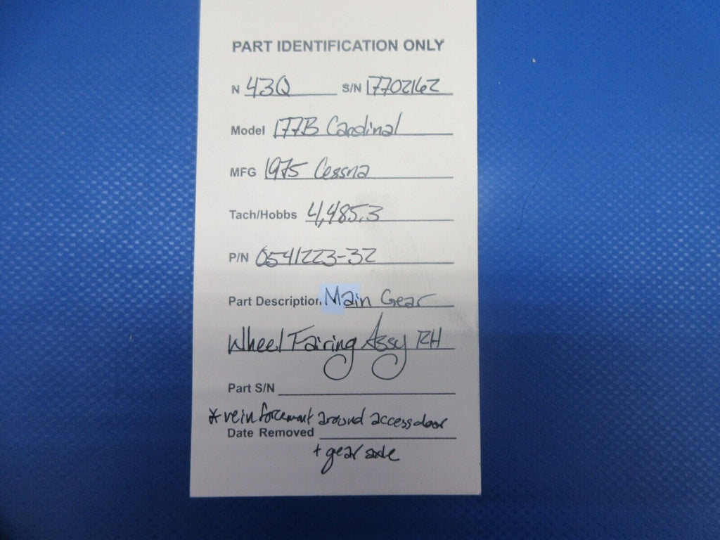 Cessna 177 / 177B Cardinal Main Gear Wheel Fairing Assembly Right Hand. P/N 0541223-32. Reinforcement around access door + gear axle. Removed in good condition from a parted out 1975 Cessna 177B Cardinal N43Q, S/N 17702162. TTAF 4,485.3. Guaranteed to pass inspection or your money back.