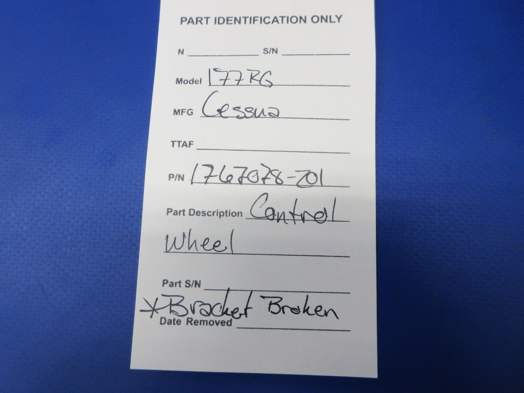 Cessna 177RG Control Wheel. P/N 1767078-201. Bracket is broken, see pictures. Guaranteed to pass inspection or your money back.