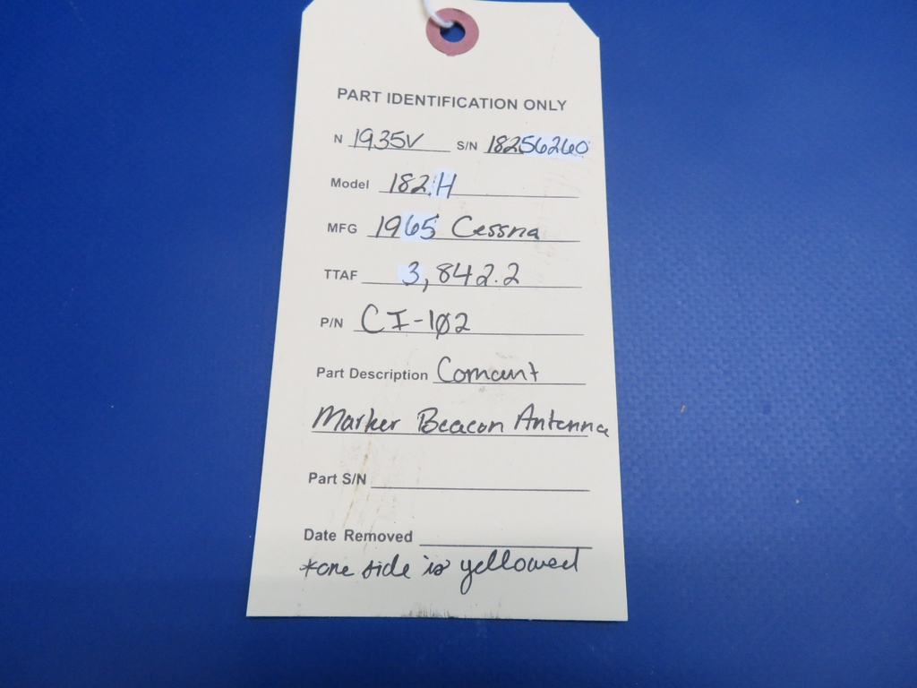 Comant Marker Beacon Antenna. P/N CI-102. Antenna is sun-faded yellow on one side. Removed in good condition from a 1965 Cessna 182H N1935V, S/N 18256260. TTAF 3,842.2. Guaranteed to pass inspection or your money back.