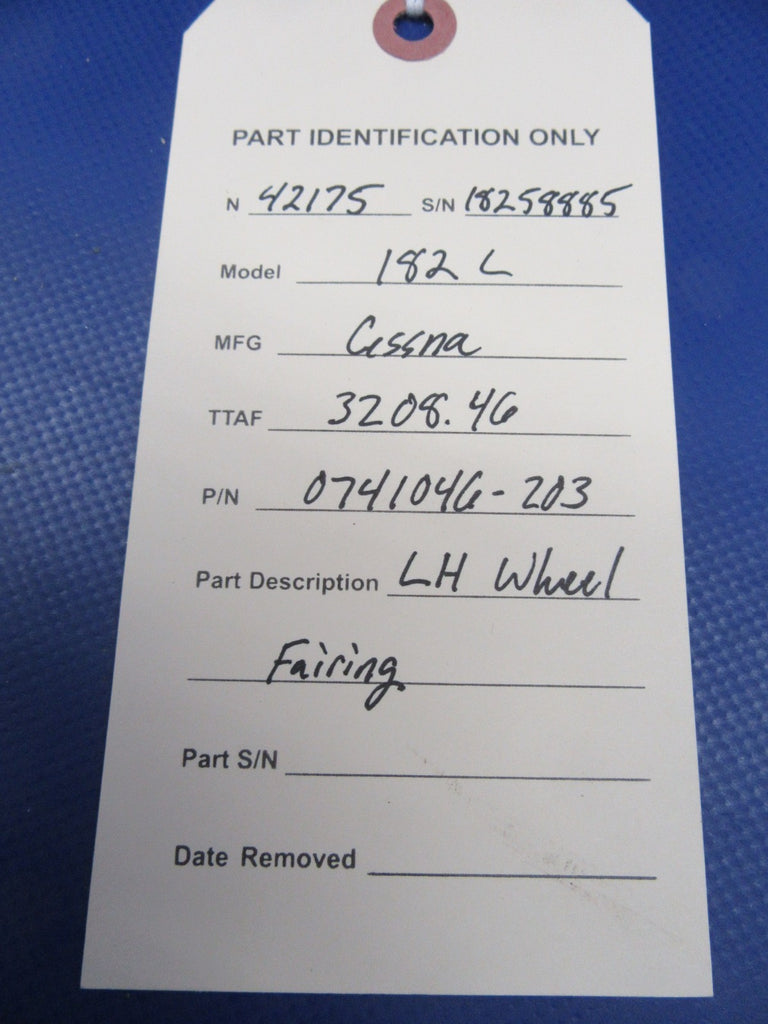 Cessna 182 / 182L LH Wheel Pant / Fairing P/N 741046-203. Removed in good condition from a parted out 1968 Cessna 182L N42175, S/N 1825885. TTAF 3,208.46. Guaranteed to pass inspection or your money back.