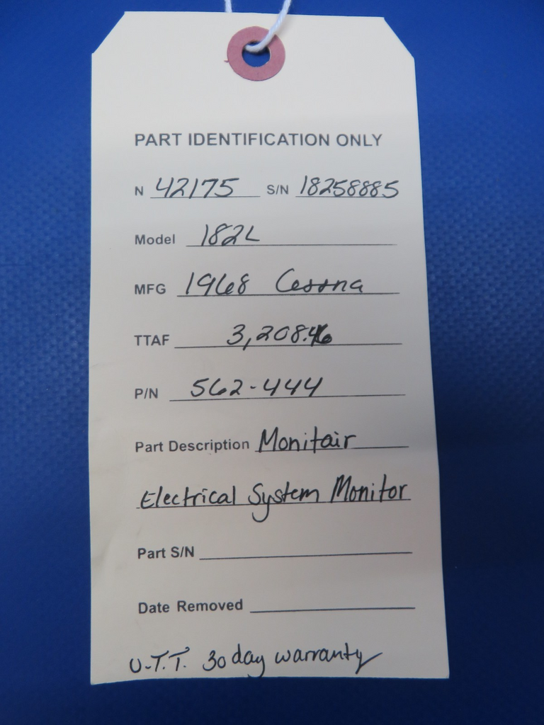 Cessna 182 / 182L Monitair Electrical System Monitor. P/N 562-444. We are unable to test this unit, however, we are selling this unit with a 30 day warranty. Removed in good condition from a parted out 1968 Cessna 182L N42175, S/N 1825885. TTAF 3,208.46. Guaranteed to pass inspection or your money back.