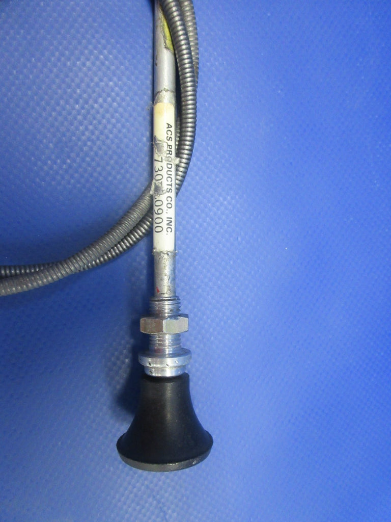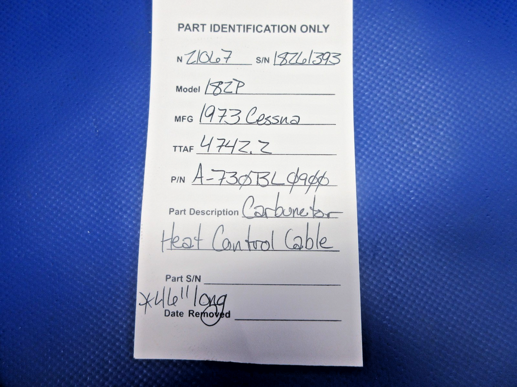 Cessna 182 / 182P Carburetor Heat Control Cable. P/N A-730BL0900. 46" Long. Removed in good condition from a parted out 1972 Cessna 182P N21067, S/N 18261393. TTAF 4,742.2. Guaranteed to pass inspection or your money back.