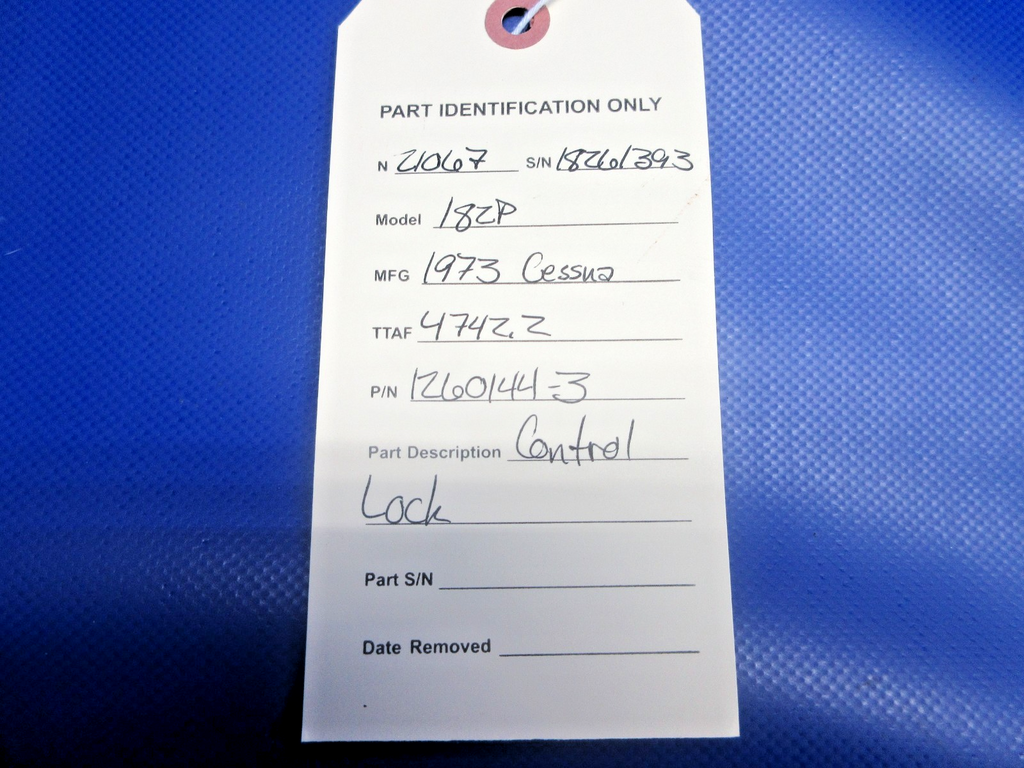 Cessna 182 / 182P Control Lock. P/N 1260144-3. Removed in good condition from a parted out 1972 Cessna 182P N21067, S/N 18261393. TTAF 4,742.2. Guaranteed to pass inspection or your money back.