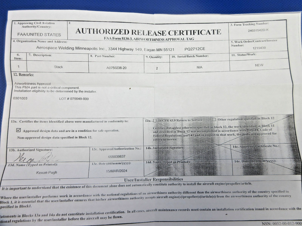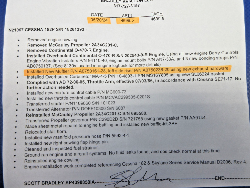 Cessna 182 / 182P Engine Exhaust Stack With Probe Holes. P/N 0750238-20, A0750238-20. 42.7 Hours since new on 05/20/2024 with 8130. Diameter of muffler attach measures approximately 2-5/8" wide. Removed in good condition from a parted out 1972 Cessna 182P N21067, S/N 18261393. TTAF 4,742.2. Guaranteed to pass inspection or your money back.