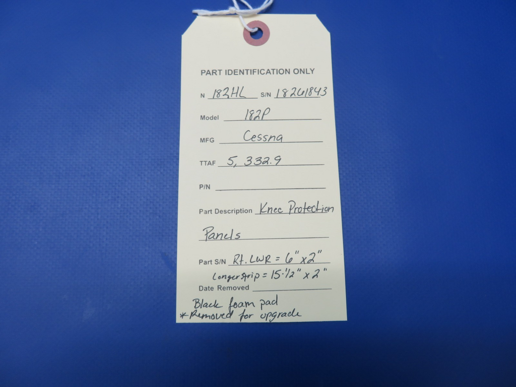 Cessna 182P / 182 Knee Protection Pads. Black Foam. Right Lower pad dimensions are 6" x 2". The Longer pad dimensions are 15-1/2" x 2". Removed in good condition for upgrade from a Cessna 182P N182HL, S/N 18261843. TTAF 5,332.9. Guaranteed to pass inspection or your money back.