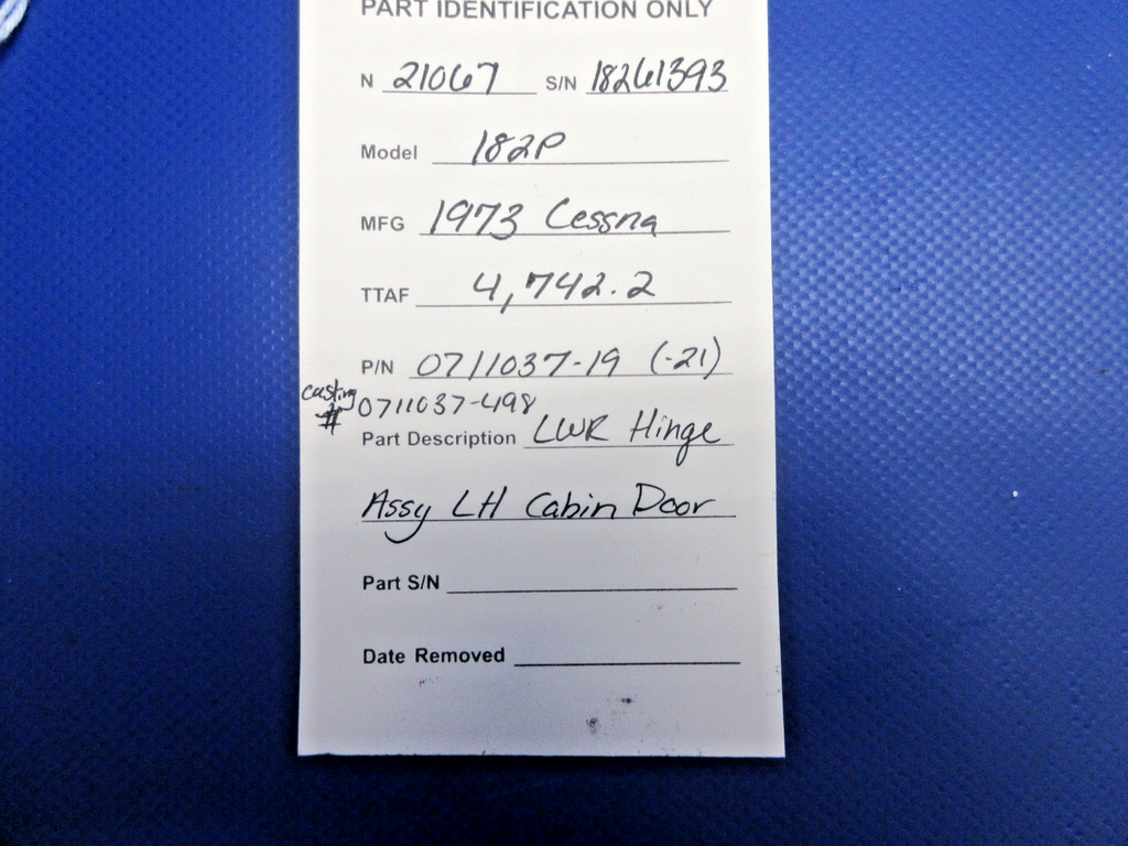 Cessna 182 / 182P Lower Hinge Assembly Left Hand Cabin Door. P/N 0711037-19, 0711037-21, Casting # 0711037-498. Removed in good condition from a parted out 1972 Cessna 182P N21067, S/N 18261393. TTAF 4,742.2. Guaranteed to pass inspection or your money back.