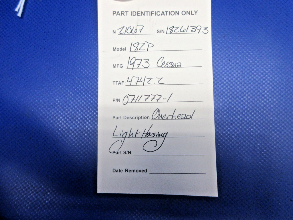 Cessna 182 / 182P Overhead Light Housing. P/N 0711777-1. Removed in good condition from a parted out 1972 Cessna 182P N21067, S/N 18261393. TTAF 4,742.2. Guaranteed to pass inspection or your money back.