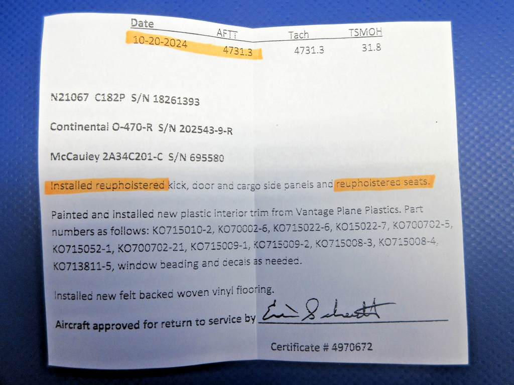 Cessna 182 / 182P Rear Bench Seat. P/N 0700678-46. Tan + Black Vinyl. 10.9 Hours since reupholstered on 10/20/2024. Removed in good condition from a parted out 1972 Cessna 182P N21067, S/N 18261393. TTAF 4,742.2. Guaranteed to pass inspection or your money back.
