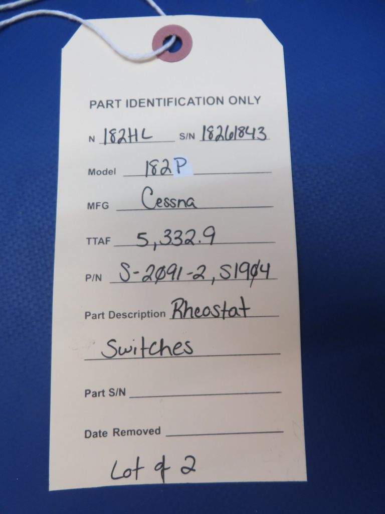Cessna 182 / 182P Rheostat Switches. P/N S-2091-2, S1904. LOT OF 2. Removed for upgrade in good condition from a Cessna 182P N182HL, S/N 182611843. TTAF 5,332.9. Guaranteed to pass inspection or your money back.