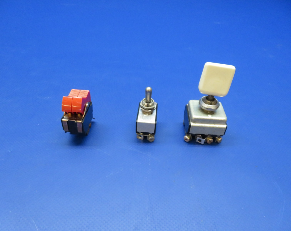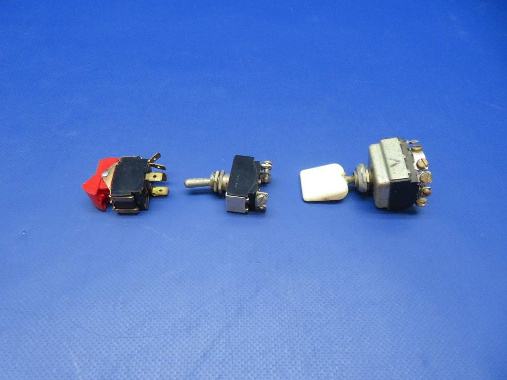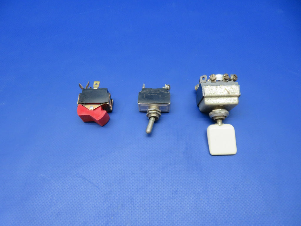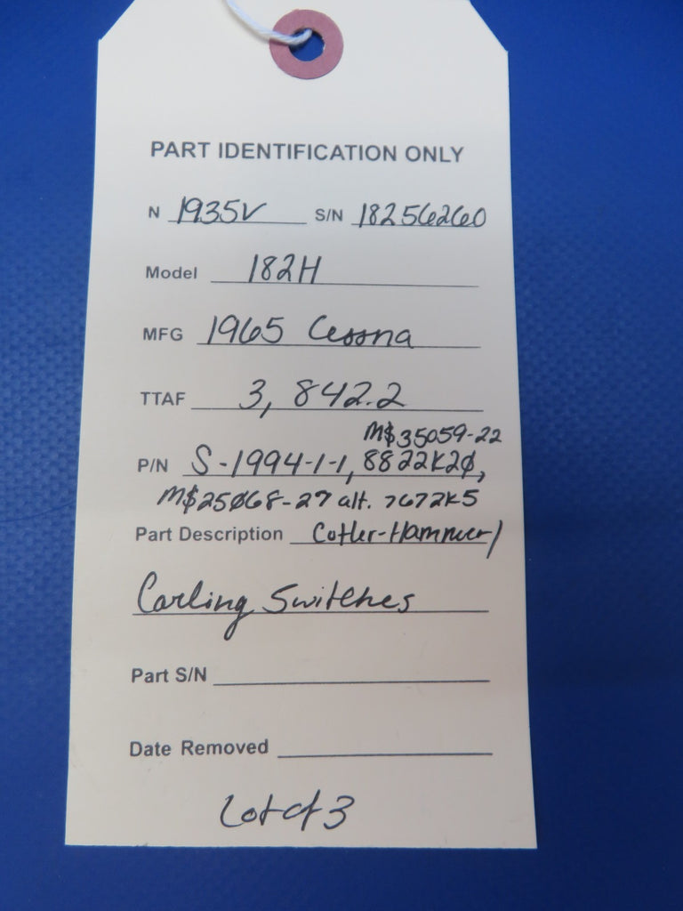 Cessna 182 Cutler Hammer / Carling Switches P/N S-1994-1-1, 8822K20, MS35059-22, MS25068-27, alt.-7672K5. LOT OF 3. Removed in good condition from a 1965 Cessna 182H N1935V, S/N 18256260. TTAF 3,842.2. Guaranteed to pass inspection or your money back.