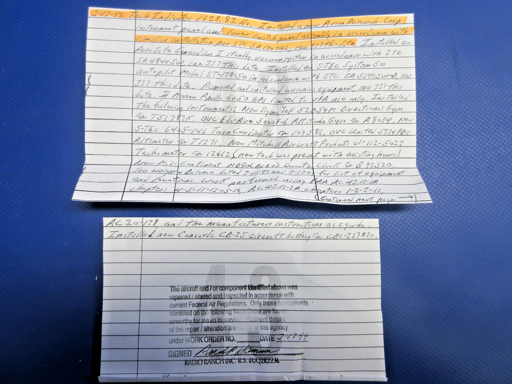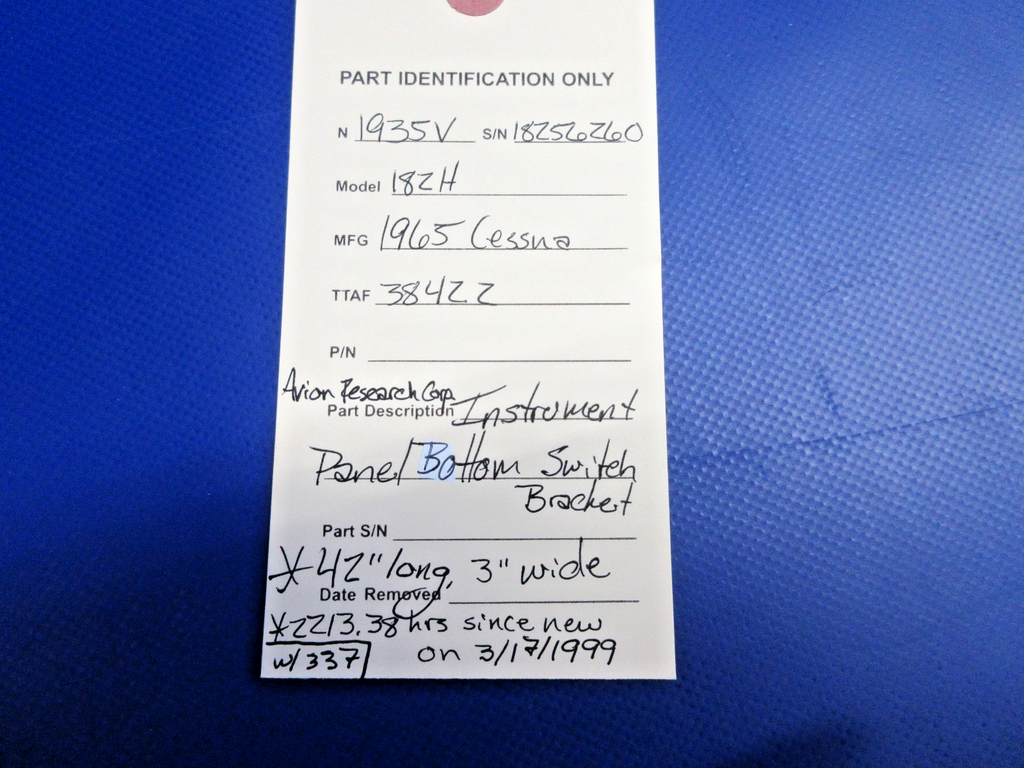 Cessna 182 / 182H Avion Research Corps Instrument Panel Bottom Switch Bracket. With 337. 42" Long. 3" Wide. 2213.38 hours since new on 03/17/1999. Removed in good condition from a 1965 Cessna 182H N1935V, S/N 18256260. TTAF 3,842.2. Guaranteed to pass inspection or your money back.