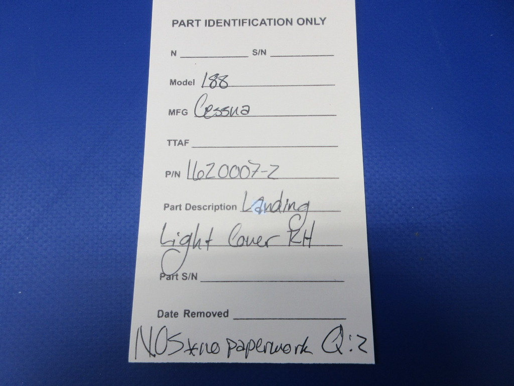 Cessna 188 Landing Light Cover Right Hand. P/N 1620007-2. NEW OLD STOCK. No paperwork. Due to multiple quantities, buyer may not receive exact item pictured. Guaranteed to pass inspection or your money back.