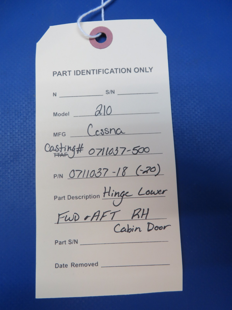Cessna 210 Hinge Lower Forward and Rear Right Hand Cabin Door. P/N 0711037-18, 0711037-20. Casting # 0711037-500. Guaranteed to pass inspection or your money back.