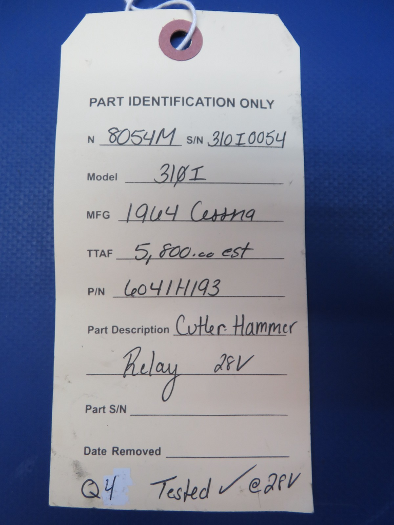 Cessna 310 / 310I Cutler-Hammer Relay 28v. P/N 6041H193. Due to multiple quantities buyer may not receive exact item pictured. This item was recently tested at 28v and found to be in working condition. Removed in good condition from a parted out 1964 Cessna 310I N8054M, S/N 310I0054. Est. TTAF 5,800.0. Guaranteed to pass inspection or your money back.
