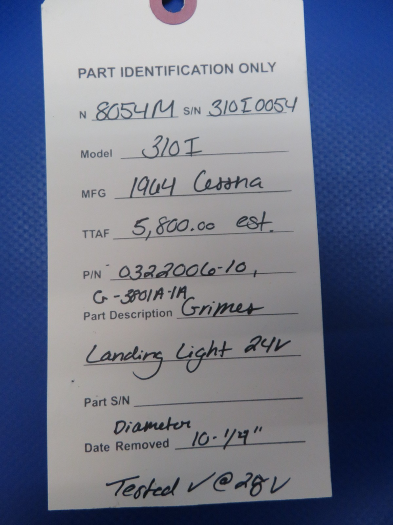 Cessna 310 / 310I Grimes Landing Light 10-1/4". 24v. P/N 0322006-10, G-3801A-1A. This item was recently tested at 28v and found to be in working condition. Removed in good condition from a parted out 1964 Cessna 310I N8054M, S/N 310I0054. Est. TTAF 5,800.0. Guaranteed to pass inspection or your money back.