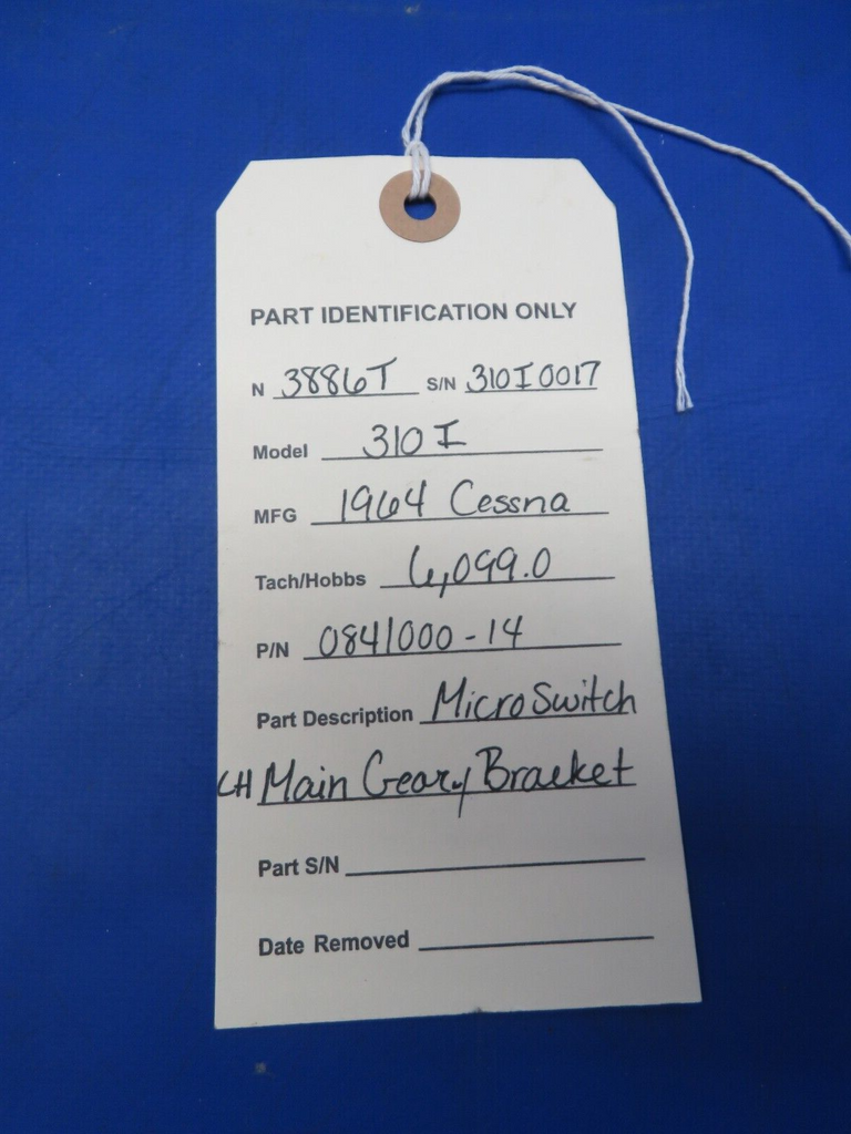 Cessna 310 / 310I Micro Switch Left Hand Main Gear Bracket. P/N 0841000-14. Removed in good condition from a parted out 1964 Cessna 310I N3886T, S/N 310I-0017. TTAF 6,099.0. Guaranteed to pass inspection or your money back.